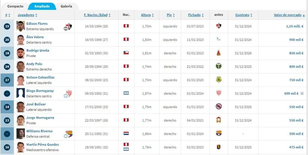 Como era de esperarse, Edison Flores es el más caro, el más significativo, y con mejor presente, según Transfermarkt. El Orejas está tazado en 1,10 millones de euros, seguido por Álex Valera con un monto bastante cercano: 900 mil euros. En el tercer puesto vemos a Rodrigo Ureña, el mediocampista chileno con su renovación de contrato reciente, alcanza los 850 mil euros.
