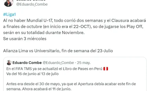 Según el periodista Eduardo Combe, el clásico entre Alianza Lima y Universitario de Deportes, que se jugará por la fecha 5 el Torneo Clausura se estaría disputando el 23 de julio.