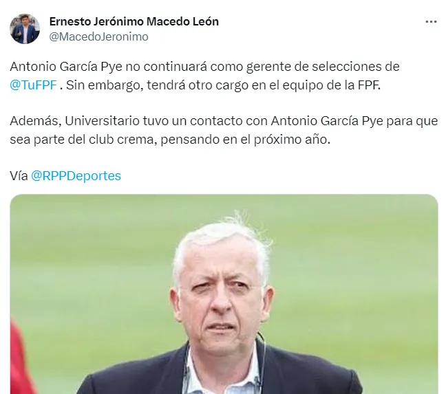 “Antonio García Pye no continuará como gerente de selecciones de la Federación Peruana de Fútbol. Sin embargo, tendrá otro cargo en el equipo de la FPF. Además, Universitario tuvo un contacto con Antonio García Pye para que sea parte del club crema, pensando en el próximo año”, reveló el periodista Jerónimo Macedo a través de su cuenta oficial de Twitter.