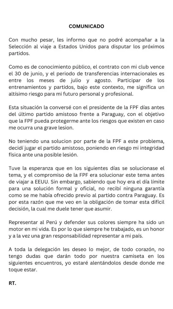 El periodista Daniel Kanashiro en DirecTV dio a conocer que Renato Tapia “no vuelve más” a la Selección de Perú. Recordar que el volante no jugó el torneo en Estados Unidos debido a una discrepancia con la Federación Peruana de Fútbol por el tema de su seguro médico para viajar.