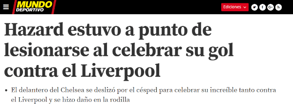 Eden Hazard le marcó un golazo al Liverpooldespués de una jugada épica y lo celebró deslizándose arrodillado por el césped.