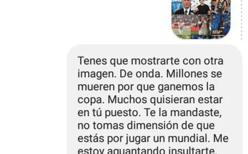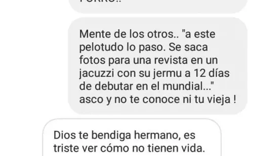 Continuando con sus mensajes, el usuario le envió un segundo texto: “Mente de los otros.. “a este pelotudo lo paso. Se saca fotos para una revista en un jacuzzi con su hermu a 12 días de debutar en el mundial…” asco y no te conoce ni tu vieja !”.