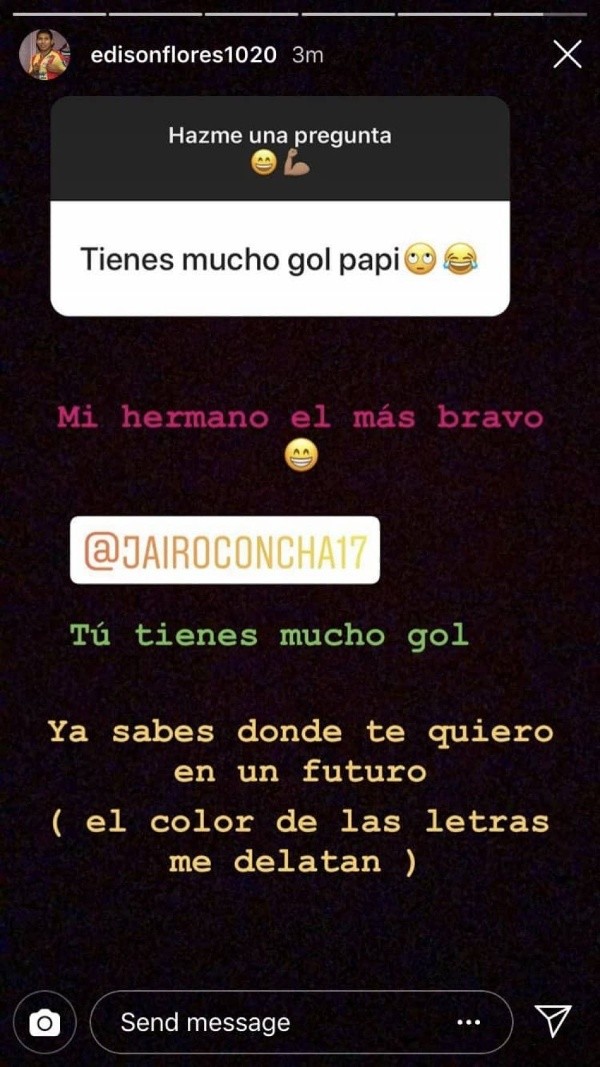 “Mi hermano, el más bravo, ya sabes donde te quiero en un futuro.El color de las letras me delatan”, fueron las palabras que le dedicó Flores a Concha. ¿Le hará caso?