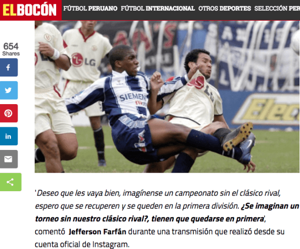 Ante esta situación, Jefferson Farfán, fanático de Alianza Lima, el clásico rival de la “U”,lanzó una curiosa frase respecto a la posibilidad de que los Cremas ya no jueguen en Primera.