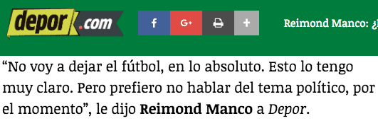Sin embargo, Manco confesó que no tiene intensiones de colgar las botas:“No voy a dejar el fútbol, en lo absoluto. Esto lo tengo muy claro. Pero prefiero no hablar del tema político, por el momento”.