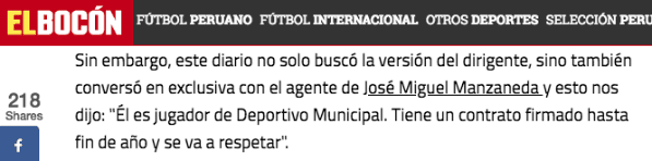 “Él es jugador de Deportivo Municipal. Tiene un contrato firmado hasta fin de año y se va a respetar”, aseguró el agente, descartando la salida de Manzanedade la Academia.