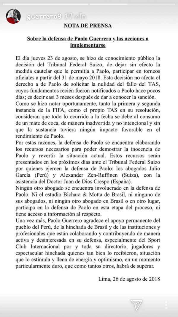 Ante esta situación, el capitán de la Selección de Perú compartió un comunicado, a través de su cuenta oficial de Instagram, donde se detallan los pasos a seguir para demostrar su inocencia.