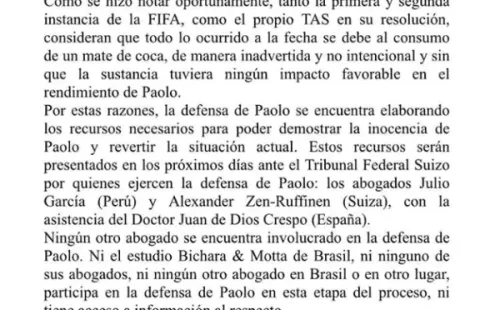 Además, en dicho comunicado, se confirmó quiénes serán los que preparen la defensa del jugador y se presenten ante el Tribunal Federal Suizo con el objetivo de que solucionar los problemas legales del Depredador.