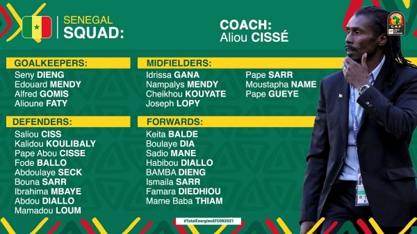 Los Leones de la Teranga clasificaron al certamen continental luego de haber finalizado como líder del Grupo I en las Eliminatorias. En este escenario, el elenco dirigido porAliou Cissé, que cuenta con Sadio Mané (Liverpool) como principal figura y pretende conquistar el título por primera vez en su historia, disputósu último duelo oficial el pasado 14 de noviembre. En aquella ocasión, venció 2-0 a Congo en el camino hacia el Mundial de Qatar.