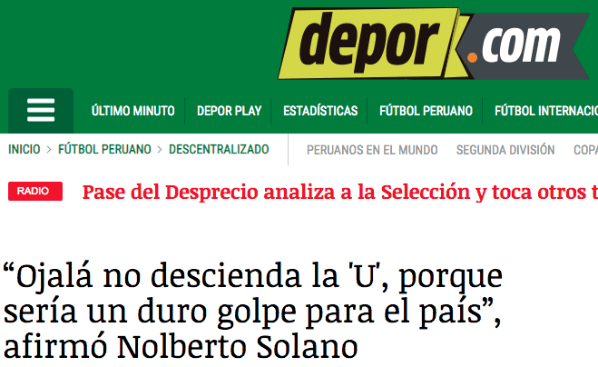 Ante esta situación, NolbertoSolano, el exentrenadorde los Cremas, opinó sobre la situación de dicha institución:“Por esa gratitud y cariño, espero que la ‘U’ luche al máximo y salga de esta situación. Hay que tener cabeza fría. Es un club importante para el país y para el fútbol peruano. Esperamos que no descienda, porque sería un golpe duro”.