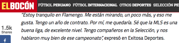 Ante este situación, el defensor peruano confesó:“Estoy tranquilo en Flamengo. Me están mirando, un poco más, y eso me gusta. Tengo un año de contrato. Por mí, me quedaría. Sé que la MLS es una buena liga, de excelente nivel. Tengo compañeros en la Selección, y nos hablaron muy bien de ese campeonato”.