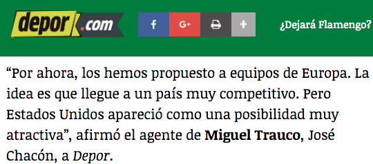 Sin embargo, el exjugador de Universitario de Deportes podría emigrar en el próximo mercado de pases, ya que según José Chacón, agente del defensor peruano, desde Estados Unidos ya habrían preguntado por él.