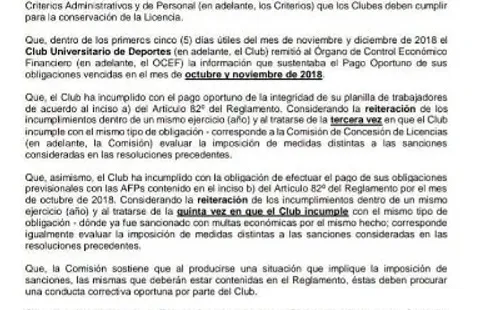 La Federación Peruana de Fútbol agregó que si el club de Lima se mantiene en la misma situación se verá afectado con sanciones mayores como puede ser el cierre total de su estadio.