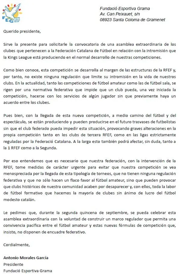 El comunicado del FE Grama explica que la Kings League está “produciendo una intromisión en el normal desarrollo” de las competencias del fútbol catalán. De acuerdo a la explicación del comunicado, el Grama exige una asamblea extraordinaria para tomar decisiones al respecto.