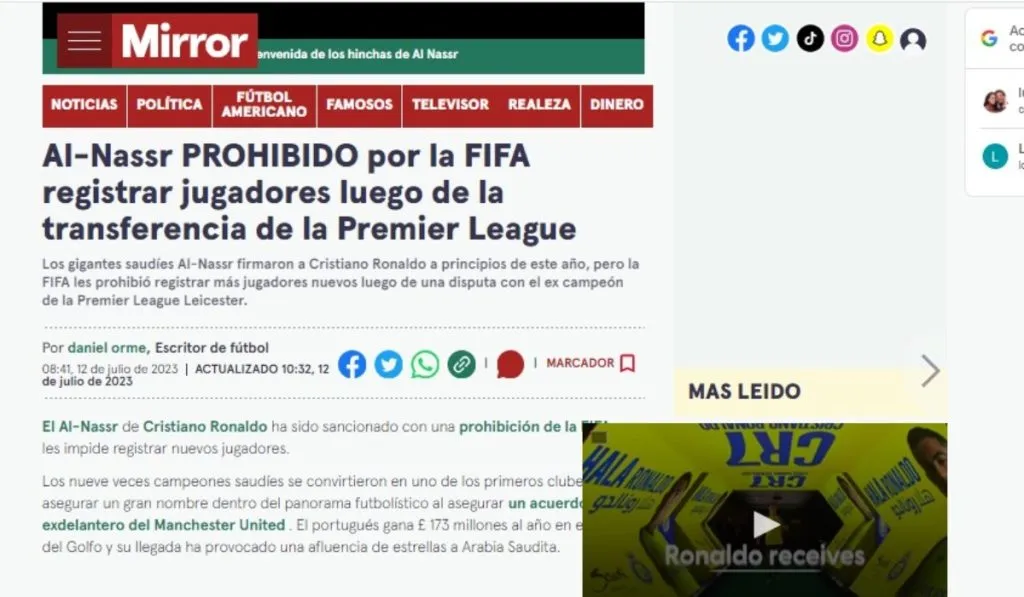 The Mirror asegura Al-Nassr y Cristiano Ronaldo se enfrentan ante su primer gran revés de un verano marcado por las incorporaciones, por los deseos de acometer grandes fichajes e igualmente por esos nombres de peso que dejan el fútbol europeo para unirse al delantero de Madeira en su aventura por Oriente Medio. La FIFA de Gianni Infantino sanciona duramente al nuevo equipo de ser reciente.