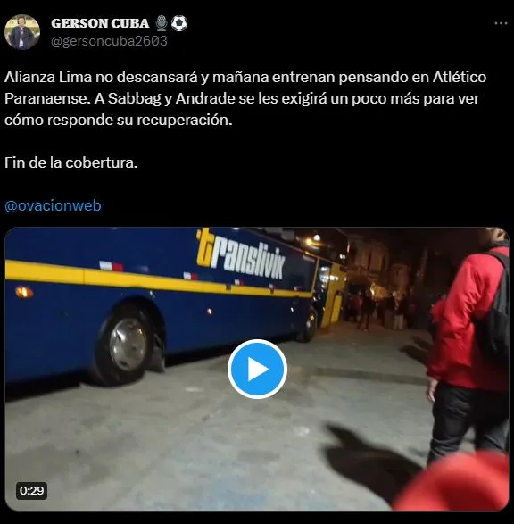 Por eso, han hecho un sacrificio importante la noche del último viernes 23 de junio, creyendo en este sueño. Según cuenta el periodista de Radio Ovación, Gerson Cuba: “Alianza Lima no descansará y mañana entrenan pensando en Atlético Paranaense. A Sabbag y Andrade se les exigirá un poco más para ver cómo responde su recuperación. Fin de la cobertura”.