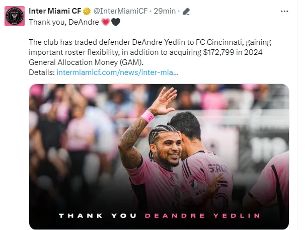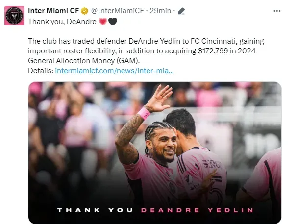 La transferencia fue confirmada por el propio Inter Miami, este lunes 4 de marzo, mediante sus cuentas oficiales de redes sociales. ”El club ha traspasado al defensor DeAndre Yedlin al FC Cincinnati, ganando una importante flexibilidad en la plantilla, además de adquirir 172.799 dólares en el Fondo de Asignación General (GAM) de 2024”, fueron los detalles principales de la noticia divulgada.