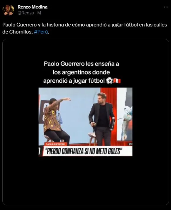 Contestando con orgullo y una sonrisa en su gesto así: “En Chorrillos, Lima. Sí, sí, he vuelto, pero no mucho porque no vivo en Perú. Yo jugaba en la pista”. Los argentinos en un principio no entendieron las palabras utilizadas, hasta que el 9 nacional contextualizó a su cultura diaria, quedando todos absortos.