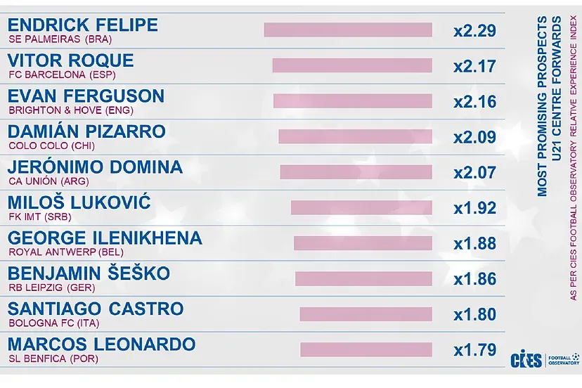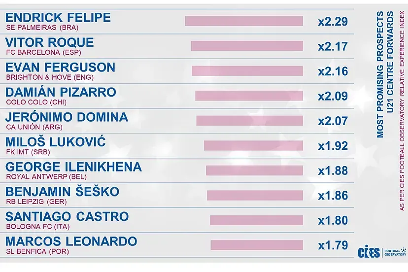 La joya brasileña de 17 años encabeza el listado que tiene en el segundo lugar a su compatriota Vitor Roque de 19, quien en enero desembarcó en el plantel del Fútbol Club Barcelona que comanda Xavi Hernández (por lo menos hasta el 30 de junio próximo) procedente del Athletico Paranaense. Asimismo, el irlandés Evan Ferguson del Brighton completa el podio.
