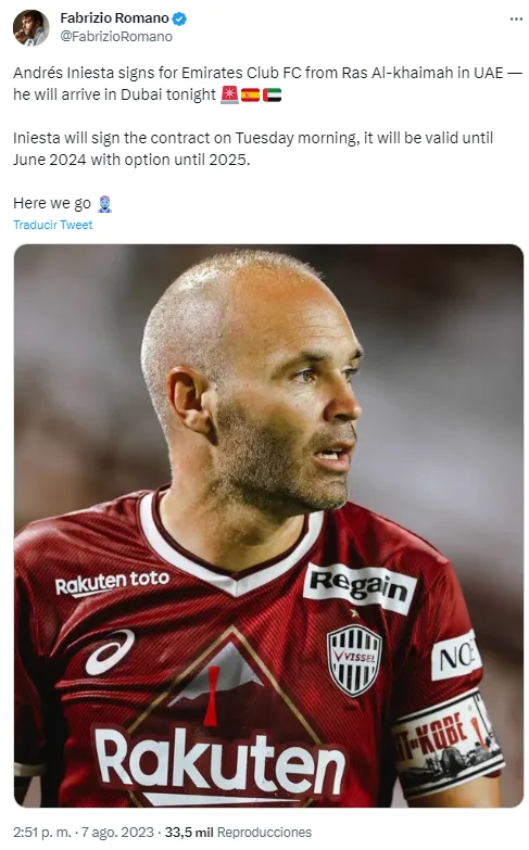 La fuente asegura que Iniesta llegó a un acuerdo con el club árabe para jugar hasta junio de 2024. Sin embargo, el contrato contaría con una opción de renovación por una temporada adicional.