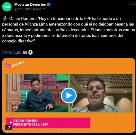 Dentro de la entrevista para Movistar Deportes, el encargado del área legal de la Asociación de Fútbol Profesional, contó este hecho. Que puede tomarse como una severa afrenta contra Alianza Lima. El cuadro bicampeón verá si toma asuntos legales, como dice el vocero de ADFP, o si lo deja pasar como algo intrascendente.