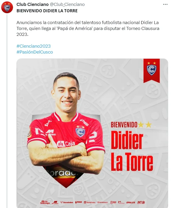 “Anunciamos la contratación del talentoso futbolista nacional Didier La Torre, quien llega al ‘Papá de América’ para disputar el Torneo Clausura 2023″, dicen las redes de Cienciano.