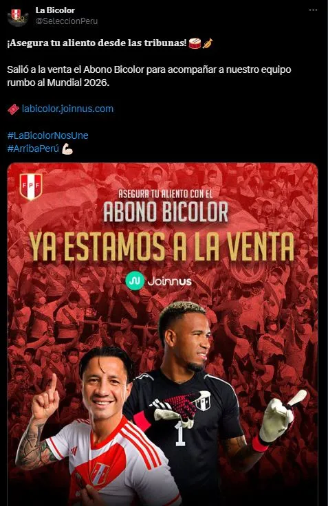 Con bombos y platillos, acercaron a su público el detalle sobre esta promoción, en teoría: “¡𝐀𝐬𝐞𝐠𝐮𝐫𝐚 𝐭𝐮 𝐚𝐥𝐢𝐞𝐧𝐭𝐨 𝐝𝐞𝐬𝐝𝐞 𝐥𝐚𝐬 𝐭𝐫𝐢𝐛𝐮𝐧𝐚𝐬! Salió a la venta el Abono Bicolor para acompañar a nuestro equipo rumbo al Mundial 2026”. Y las respuestas fueron casi unísonas.