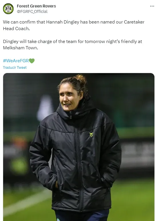 Este martes, Forest Green Rovers anunció a Hannah Dingley como entrenadora interina del primer equipo. La directora técnica galesa se hará cargo del plantel que jugará la League Two esta temporada hasta que la directiva encuentre a quien ocupe oficialmente el puesto.