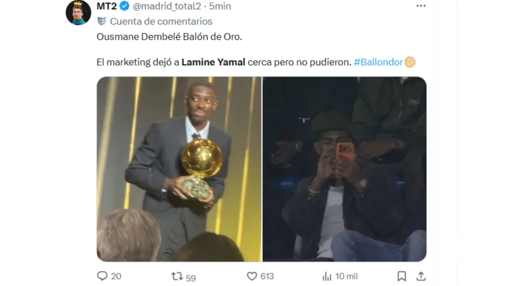 Finalmente se confirmó que Dembélé fue el balón de Oro 2025. El jugador francés fue el más votado y se llevó el primer galardón de esta categoría para su carrera. Lamine Yamal se quedó muy cerca al ser el segundo y el podio lo completó Vitinha.