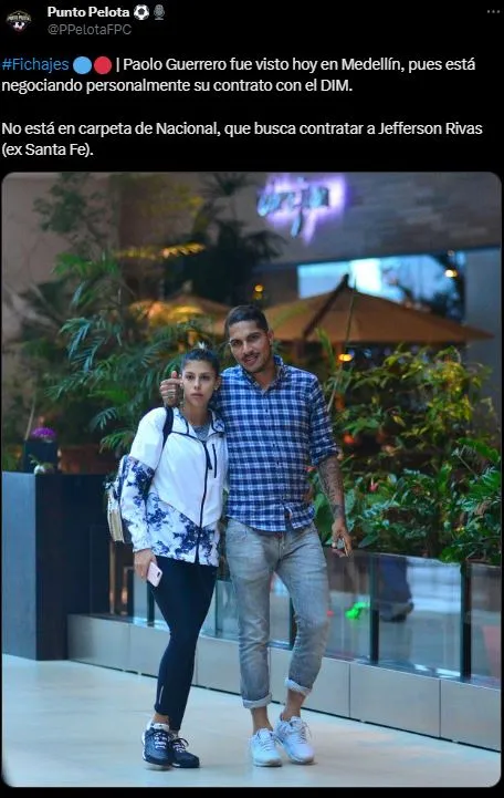 Punto Pelota, medio de comunicación colombiano en Twitter, lanzó un dato interesante: “Paolo Guerrero fue visto hoy en Medellín, pues está negociando personalmente su contrato con el DIM. No está en carpeta de Nacional, que busca contratar a Jefferson Rivas (ex Santa Fe)”.
