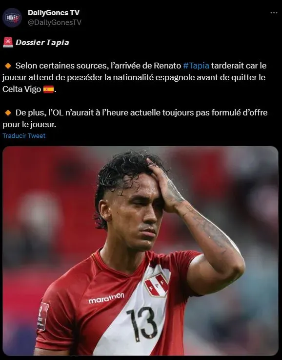 Lo cuenta así el medio de comunicación con información especializada en el Olympique Lyon: “Según algunas fuentes, la llegada de Renato Tapia se retrasaría porque el jugador está a la espera de tener la nacionalidad española antes de marcharse del Celta de Vigo”.