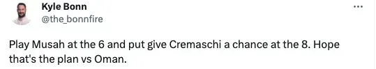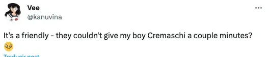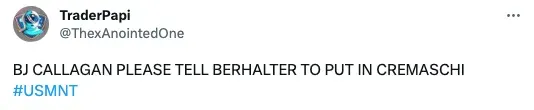 “Denle la chance a Cremaschi”, “¿Dónde está Cremaschi?”, “Necesita minutos” y “díganle a Berhalter que lo ponga”, fueron parte de los comentarios en la plataforma “X”, también conocida anteriormente como Twitter, donde se exigió el ingreso del compañero de Lionel Messi.