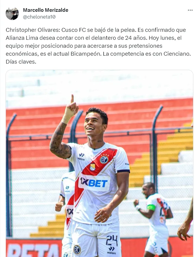 “Christopher Olivares: Cusco FC se bajó de la pelea. Es confirmado que Alianza Lima desea contar con el delantero de 24 años”, comentó la publicación en Twitter.
