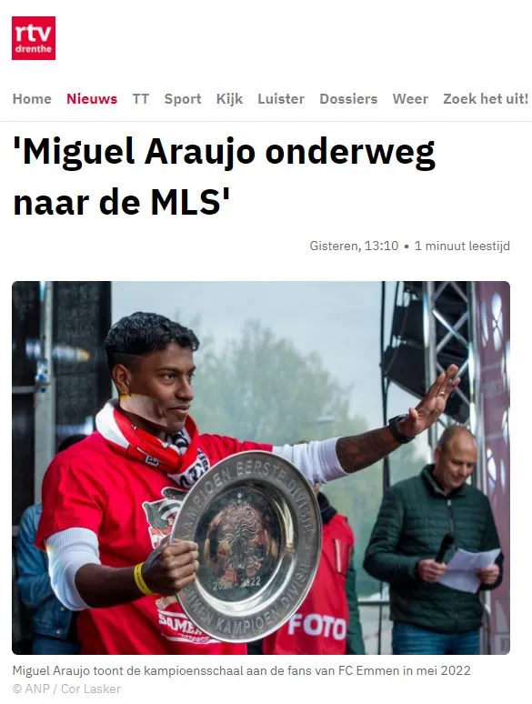 En el artículo donde brindan toda la información, inician así: “FÚTBOL – Se quedó tras el primer descenso, pero tras la nueva salida de la Eredivisie, Miguel Araujo ha renunciado a Drenthe. El defensa peruano deja el FC Emmen y muy probablemente firme contrato en América próximamente”.