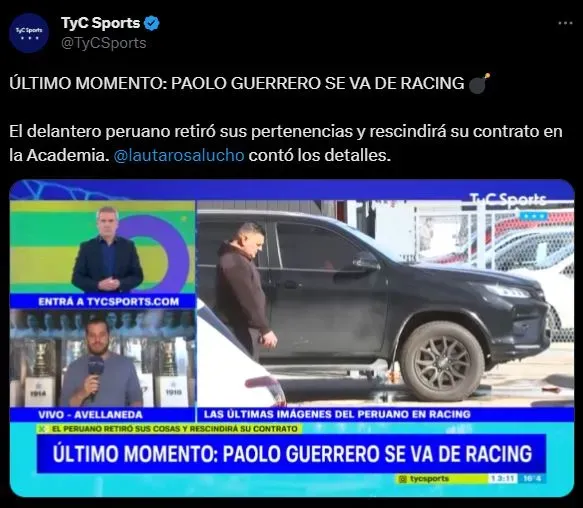 Como medida de reciente, TyC Sports envió la noticia caliente al aire: “ÚLTIMO MOMENTO: PAOLO GUERRERO SE VA DE RACING. El delantero peruano retiró sus pertenencias y rescindirá su contrato en la Academia. Lautaro Salucho contó los detalles”.