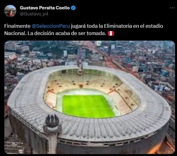La última movida al respecto se pudo conocer, como siempre, gracias a la información del periodista del Diario Líbero, Gustavo Peralta, en su cuenta de Twitter: “Finalmente la Selección Peruana jugará toda la Eliminatoria en el estadio Nacional. La decisión acaba de ser tomada”.