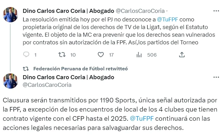 A través de su abogado, Dino Caro, la postura de la FPF es mantener la línea y no permitir la transmisión de duelos por Consorcio Fútbol Perú.