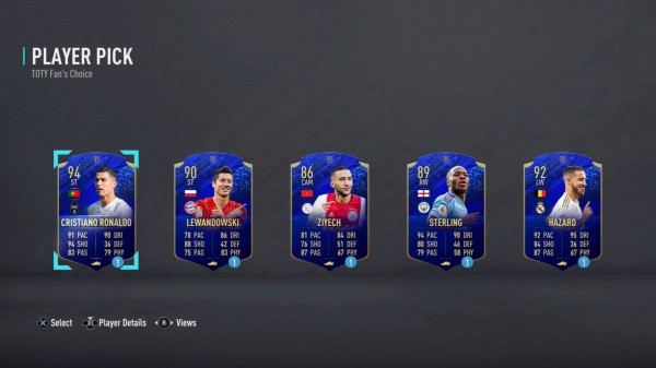 Además del centrodelantero del Piemonte Calcio, los jugadores pueden optar por otras cuatro opciones: Robert Lewandowski, centroatacante del Bayern Munich, Raheem Sterling, extremo derecho del Manchester City, Hakim Ziyech, mediapunta del Ajax y Eden Hazard, extremo izquierdo del Real Madrid.