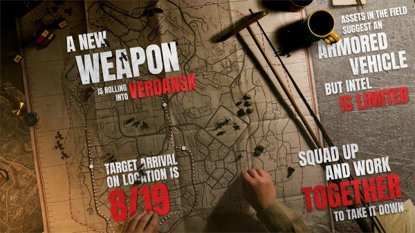 Antes de estrenarlo, la cuenta oficial de Call of Duty lanzó un par de imágenes, que dan las primeras pistas del evento. En la primera, que se puede ver abajo,se habla sobre una “nueva arma” en Verdansk, además de que se menciona un “vehículo acorazado” que deberemos bajar con nuestro escuadrón.