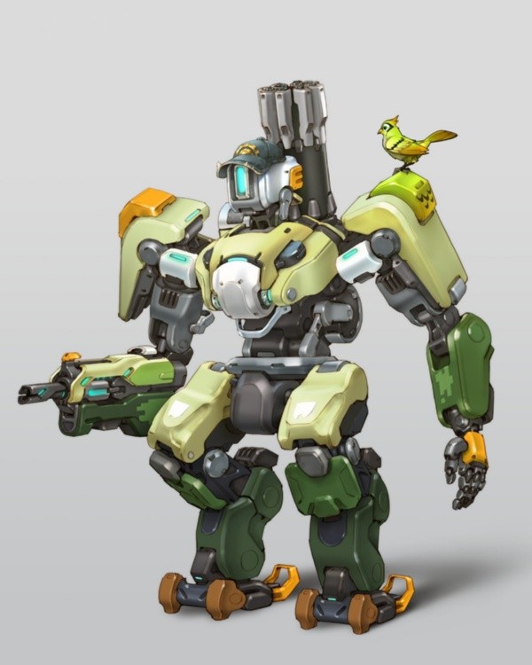 Tal como se puede ver más abajo, el héroe robótico se verá bastante parecido al primer juego, pero con un nuevo diseño de colores. Estará con su ave amiga como siempre, y tendrá una gorra, que es el añadido más notable y puede estar relacionada con Torbjorn.