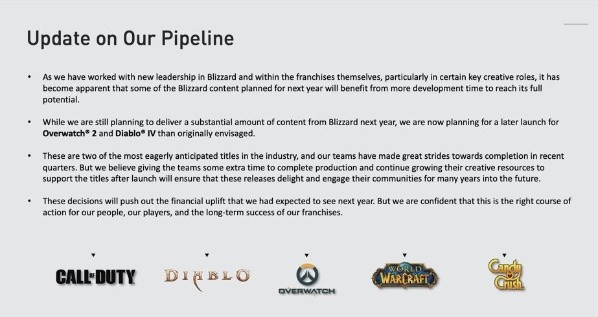 Agregaron que“estamos planeando un lanzamientomás atrasado paraOverwatch 2yDiablo 4que el que previmos originalmente“. Aclararon que siguen planeando contenido para el año que viene.