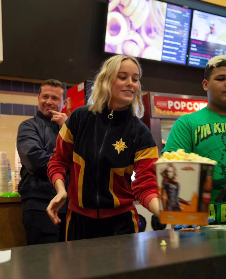 La ganadora del Oscar (Room – 2015), se encargó de repartir palomitas y bebidas a varios fanáticos en un cine de New Jersey durante unos minutos previo al inicio de la película y también se sacó fotos con algunos de ellos.