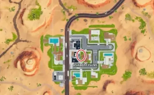 Se puede encontrar justo al norte del “Oasis Ostentoso” que se lee en el mapa de Fortnite, junto a una pared de ladrillos. La señal se encuentra detrás de la tienda del Rey de los Teclados, en frente al gran edificio del Hotel 23.