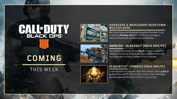 También habrá dos nuevas playlists para Nuketown en los modos mercenario y hardcorey el mod IX Gauntlet llegará al modo zombies en las mismas plataformas que Emboscada.