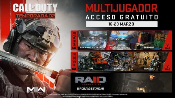 Del 16 al 20 de marzo, los jugadores del acceso gratuito podrán pelear en seis mapas multijugador y en una gran variedad de modos de juego junto con el primer Raid cooperativo. Inviten a tus amigos y familiares a competir, tanto si han sido sus compañeros de escuadrón enCall of Duty: Warzone 2.0o si es la primera vez que participan.