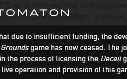 El motivo: su estudio, Automaton Games, se declaró en bancarrota. Esto implica que el juego será cancelado y el resto de los juegos del estudio serán entregados a otra firma, como elshootermultijugador Deceit. Para que de esta manera puedan seguir siendo utilizados.