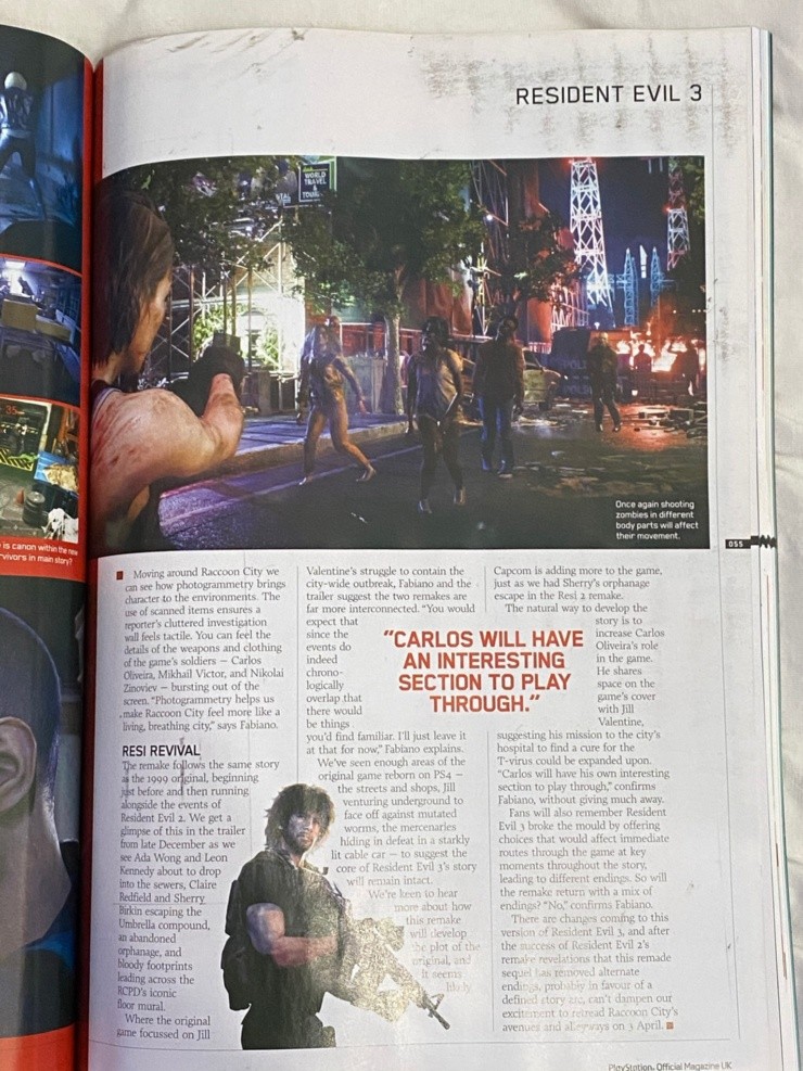 La más reciente edición de la PlayStation Magazine UK contó con una entrevista exclusiva de Capcom en la que se habló sobre las características que los jugadores podrán esperar en el nuevo juego y, a diferencia del RE2,“Resident Evil 3 tendrá más áreas abiertas para jugar”.Además, el personaje Carlos Oliveira tendrá“su propia parte interesante para jugar”,confirmó el productor del juego Peter Fabiano.