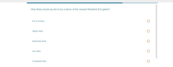 La encuesta es extensa, y pasa de preguntar sobre la experiencia de los jugadores en la franquicia Resident Evil, hasta preguntas de qué les interesó del juego y qué les gustaría ver en él. Pero lo que más llamó la atención fue una pregunta específica, sobre una posible Demo del juego.