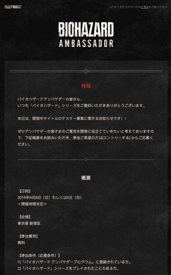 La División 1 de Capcom, responsable por el desarrollo de las series Resident Evil y Devil May Cry lanzó un mensaje de reclutamiento para los “embajadores de Resident Evil” en búsqueda de “probadores de juegos”. Los detalles fueron mínimos, aunque se destacó que las pruebas serán llevadas a cabo el 8 o 9 de septiembre y que se necesita de personas que hayan jugado la serie Resident Evil.
