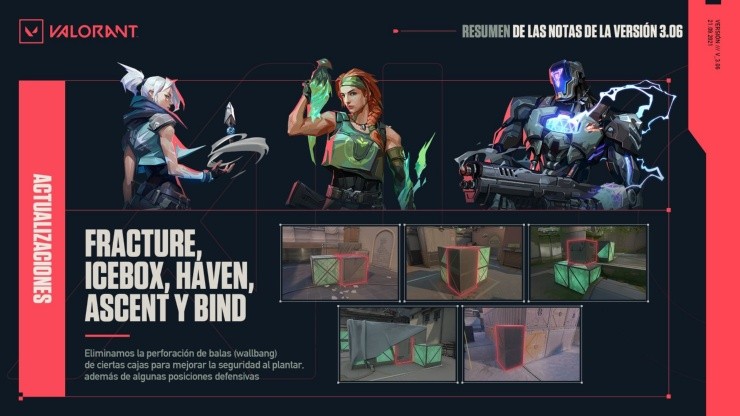 Con el final del VALORANT Masters 3, Riot Games ha tomado nota y decidió hacer varios cambios en el nuevo parche de VALORANT. Se trata de la versión 3.06, que se lanzó hoy con cambios en cinco mapas, ajustes para tres agentes y el esperado lanzamiento de Fracture en la cola competitiva.